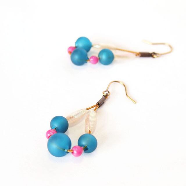 彩度の高いブルーとピンクのビンテージビーズを使用した、涼やかな印象のピアスです。耳元でゆらゆら揺れる吊り下げタイプ。sold outでしたが