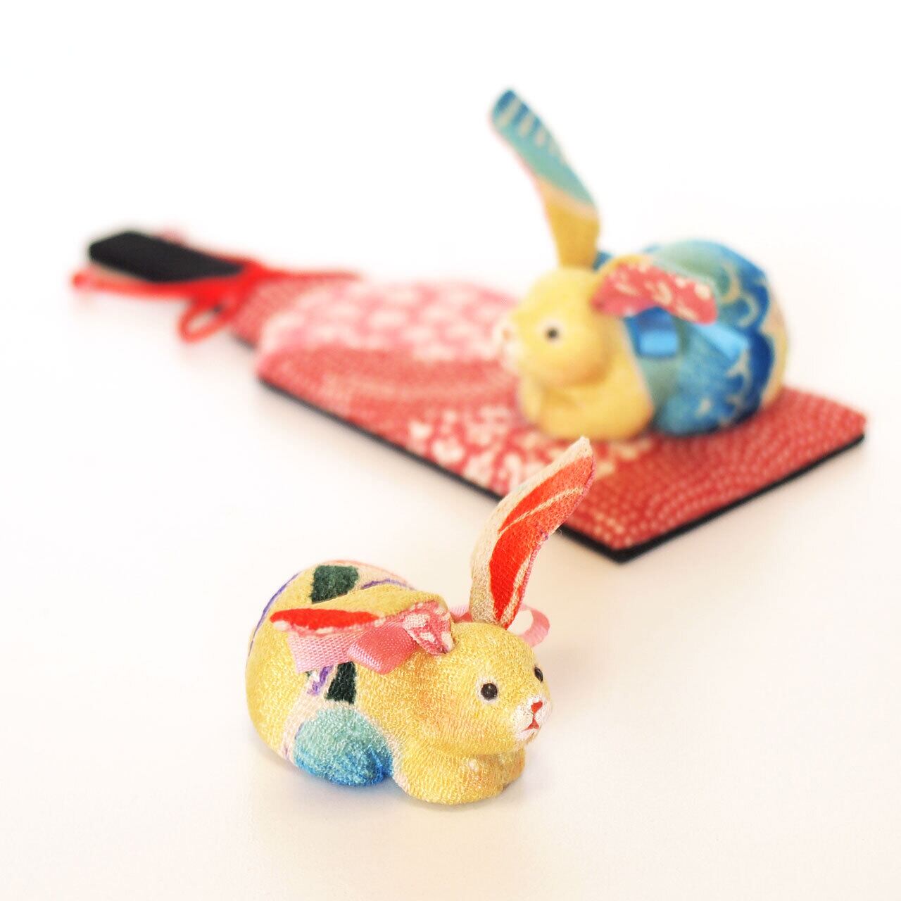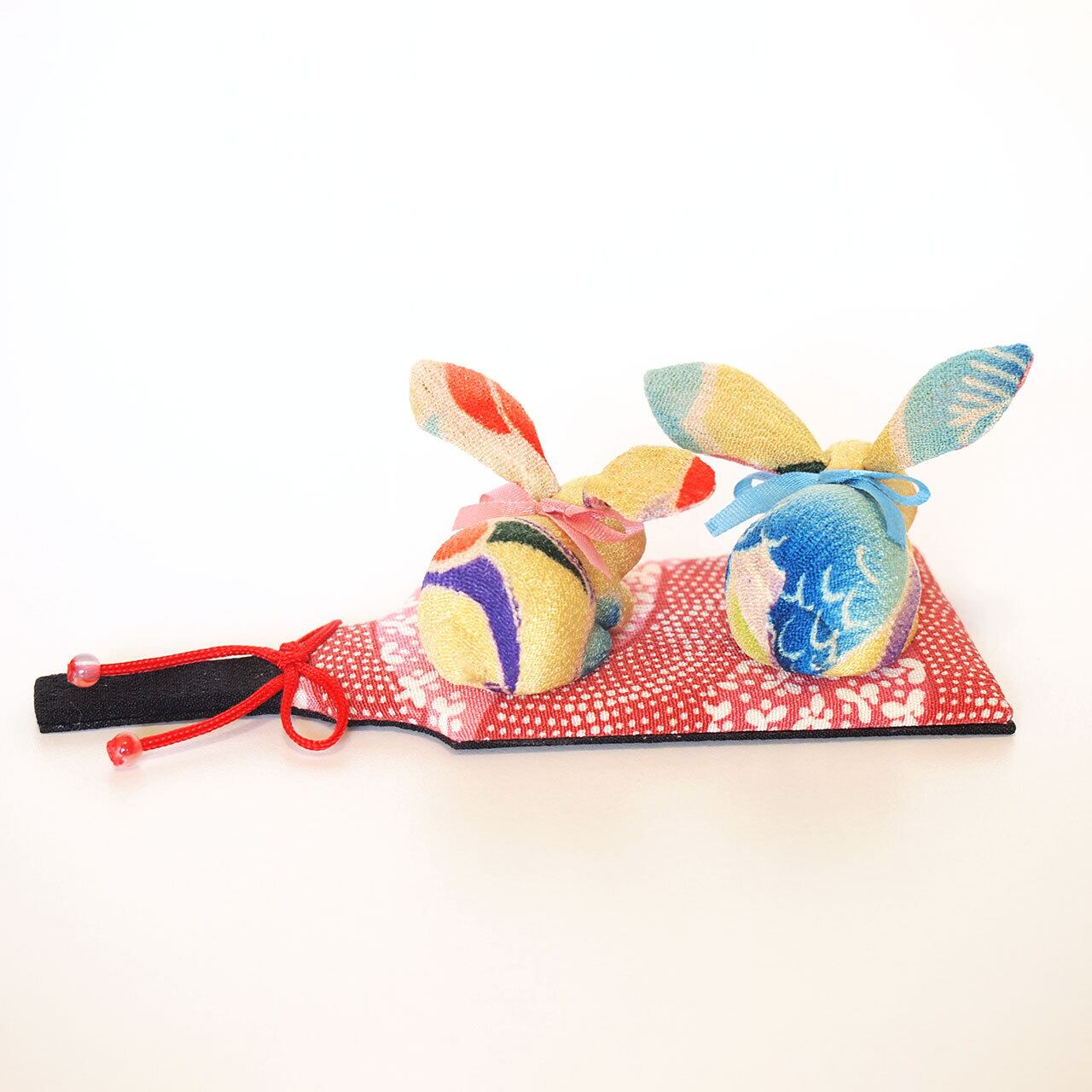 商品紹介:小さなミニうさぎさんが2羽、羽子板の上に…愛らしいつがい?お友達かしら?のせて飾っても別々に飾っても可愛いですね。